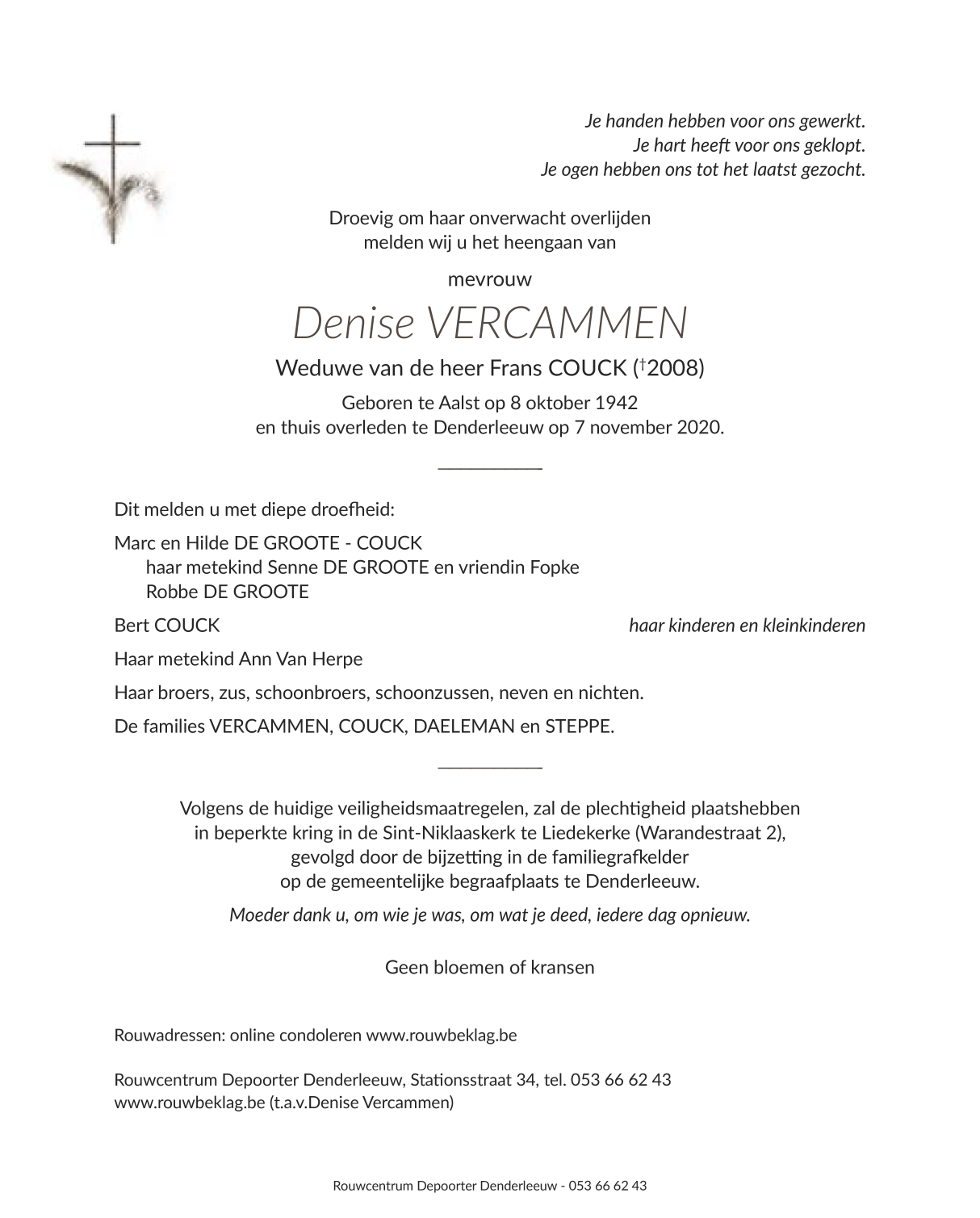 Décédée à Denderleeuw (9470) le samedi 7 novembre 2020 à l'âge de 78 ans