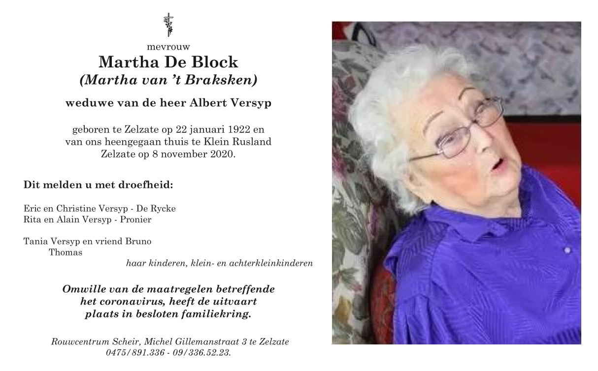Décédée à Zelzate (9060) le dimanche 8 novembre 2020 à l'âge de 98 ans