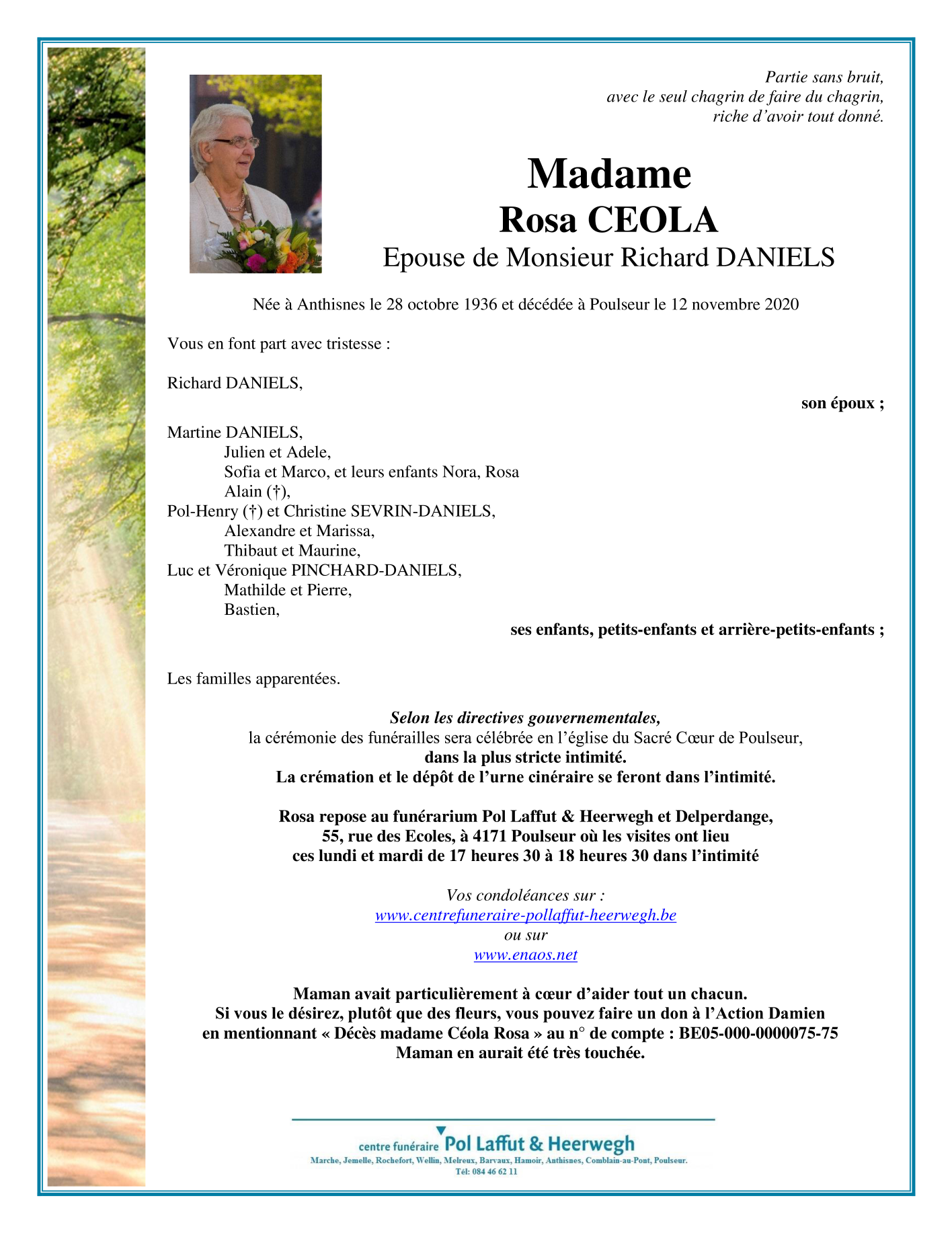 Décédée à Poulseur (4171) le jeudi 12 novembre 2020 à l'âge de 84 ans