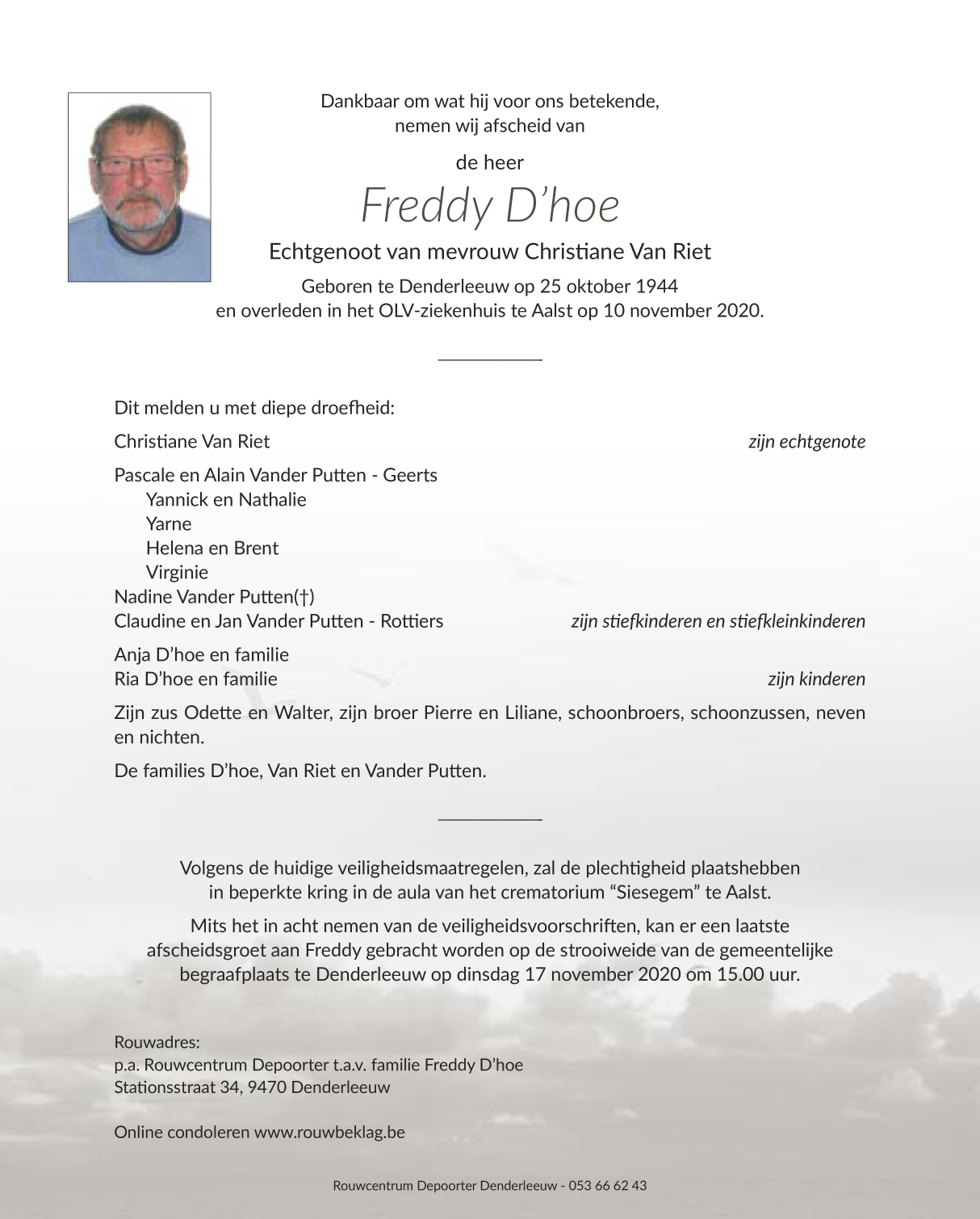 Décédé à Aalst (9300) le mardi 10 novembre 2020 à l'âge de 76 ans