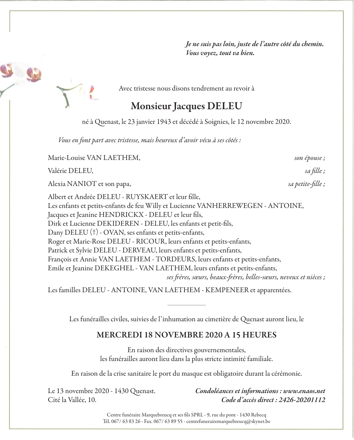 Died in Soignies (7060) on 12 November 2020 at the age of 77 years
