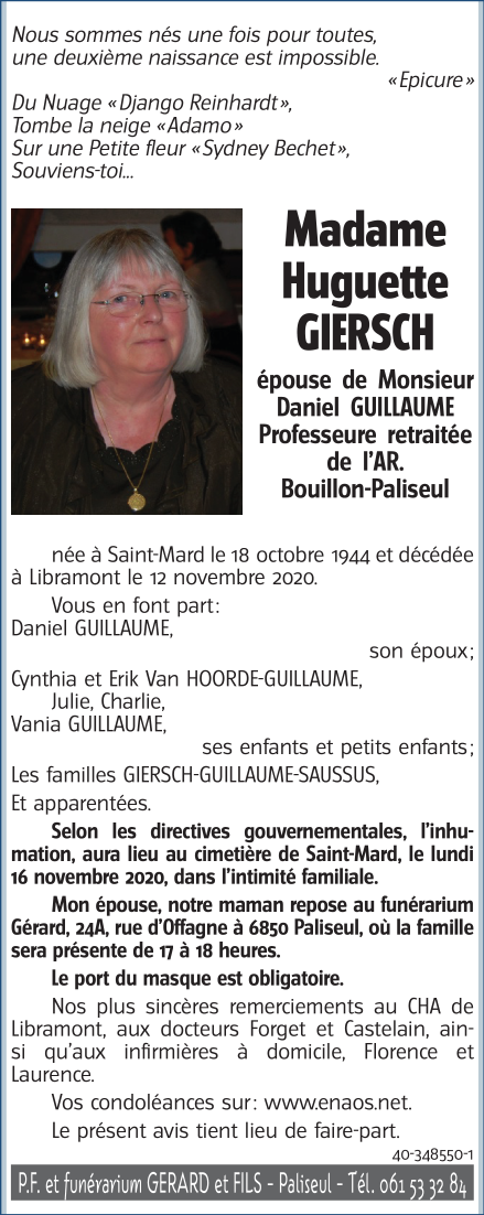 Décédée à Libramont (6800) le jeudi 12 novembre 2020 à l'âge de 76 ans