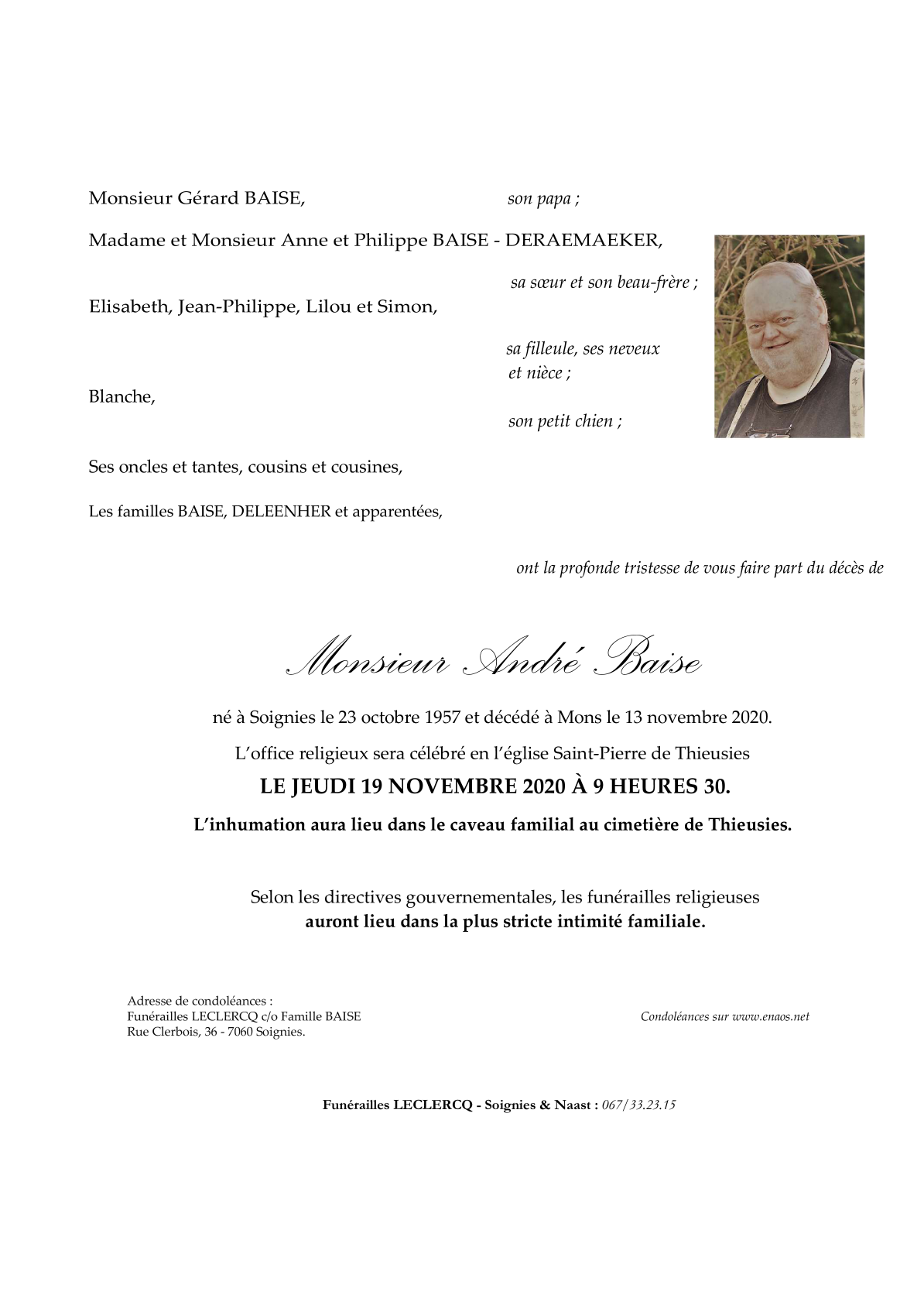 Décédé à Mons (7000) le vendredi 13 novembre 2020 à l'âge de 63 ans