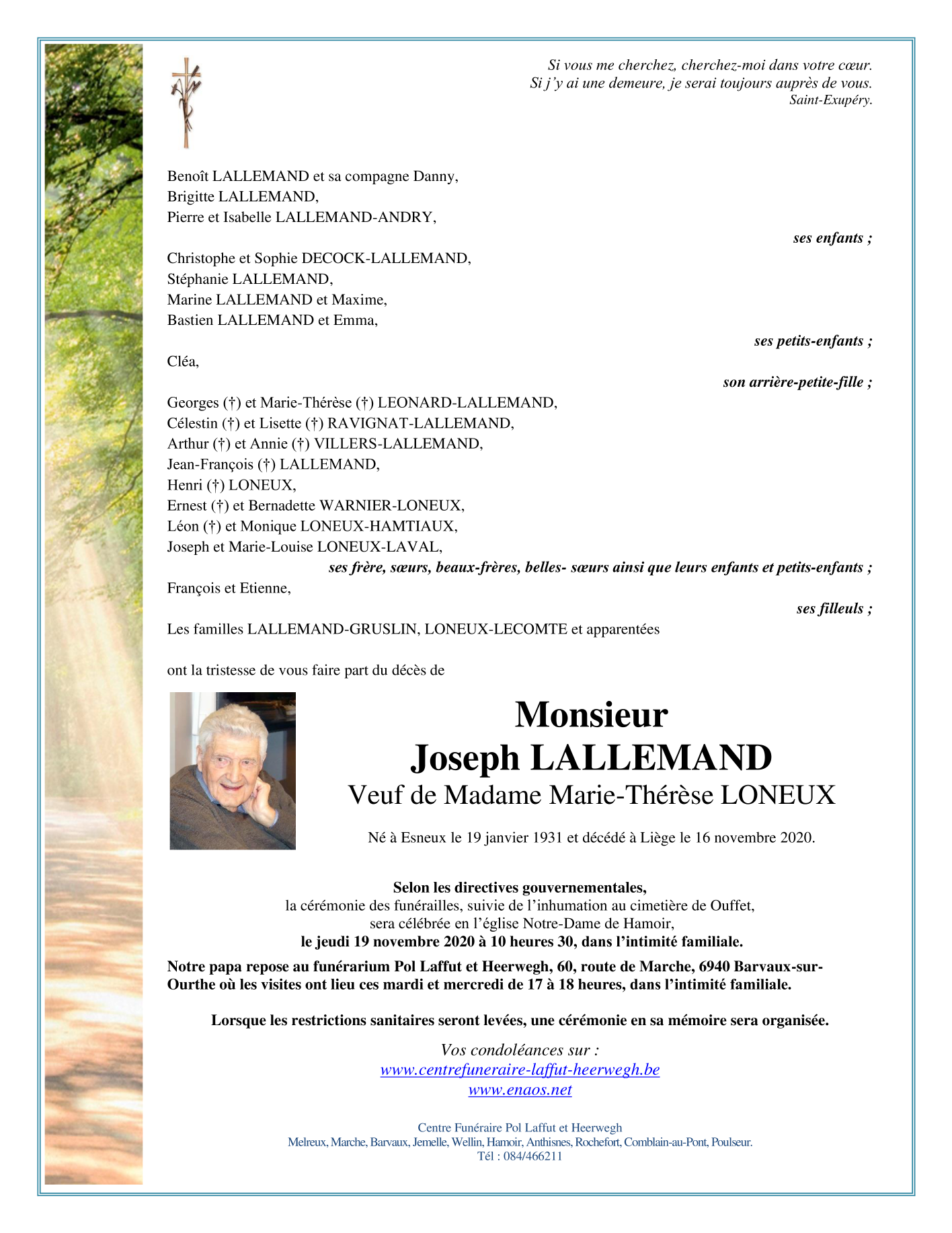 Décédé à Liège (4000) le lundi 16 novembre 2020 à l'âge de 89 ans