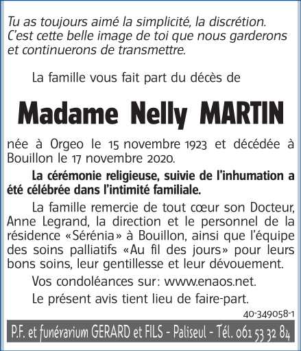 Décédée à Bouillon (6830) le vendredi 20 novembre 2020 à l'âge de 97 ans