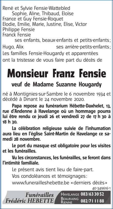 Décédé à Dinant (5500) le mardi 24 novembre 2020 à l'âge de 86 ans