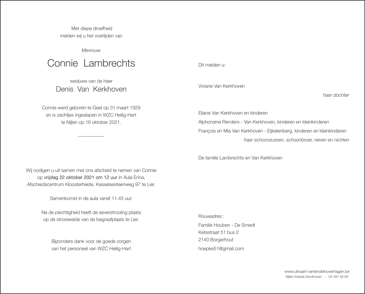 Décédée à Nijlen (2560) le samedi 16 octobre 2021 à l'âge de 92 ans
