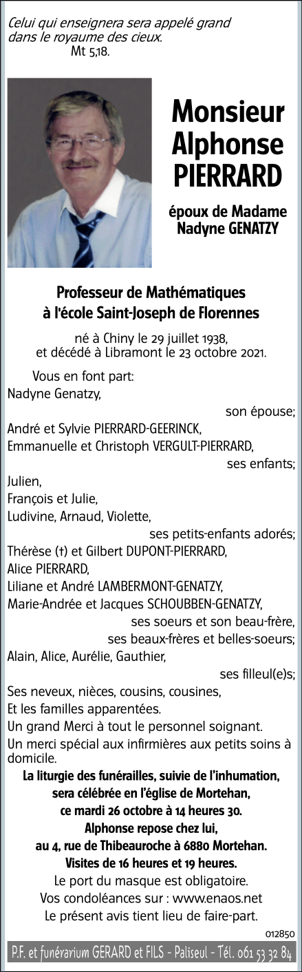 Fallecido en Libramont (6800) el sábado, 23 de octubre de 2021 a la edad de 83 años