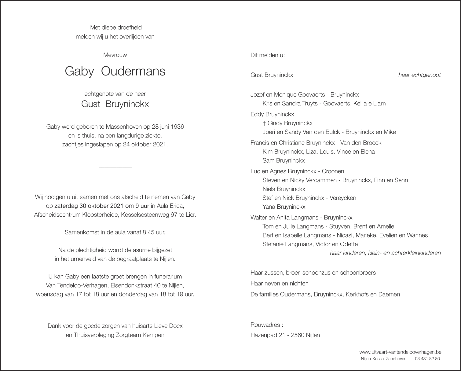 Fallecida en Nijlen (2560) el domingo, 24 de octubre de 2021 a la edad de 85 años