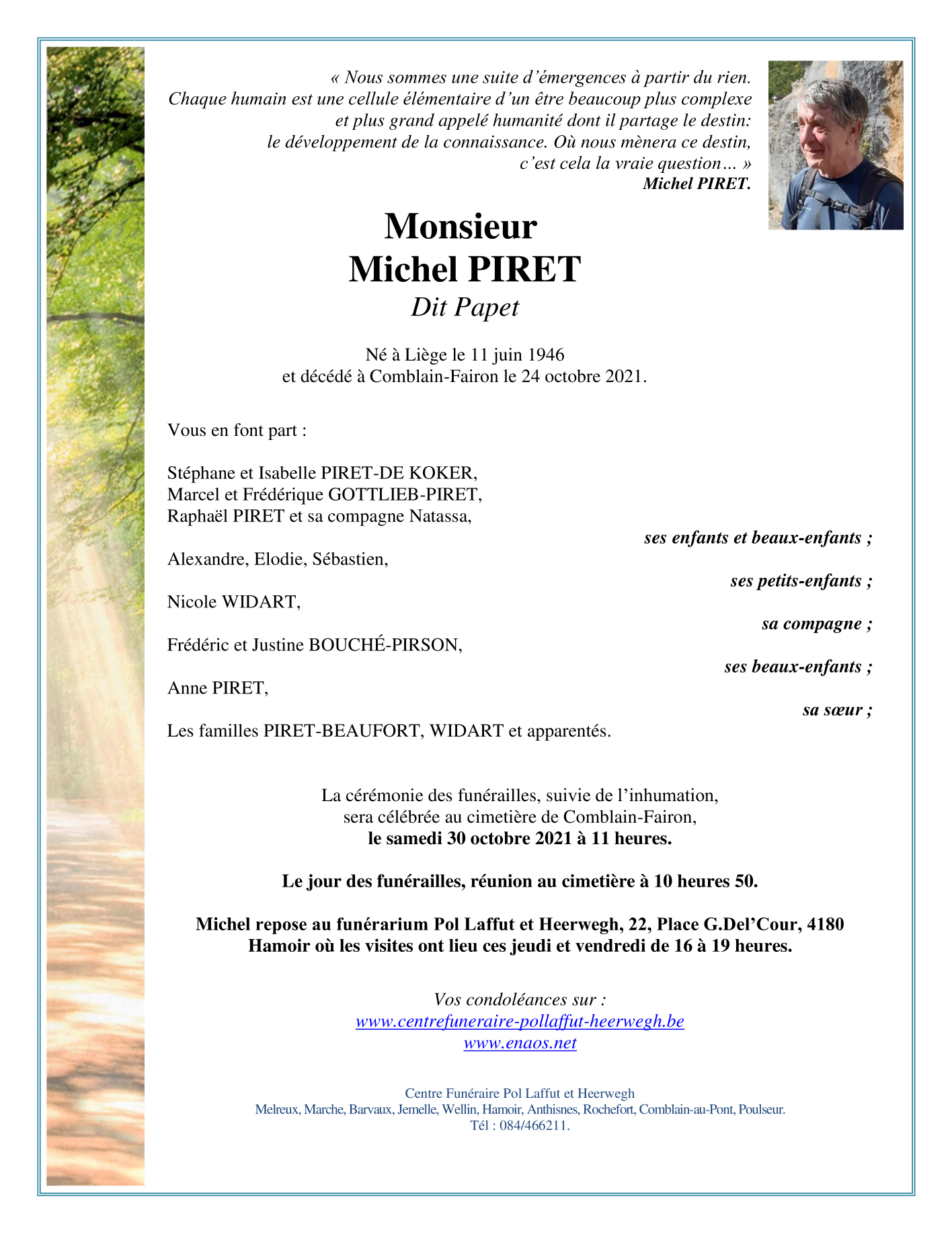 Décédé à Comblain-Fairon (4180) le dimanche 24 octobre 2021 à l'âge de 75 ans