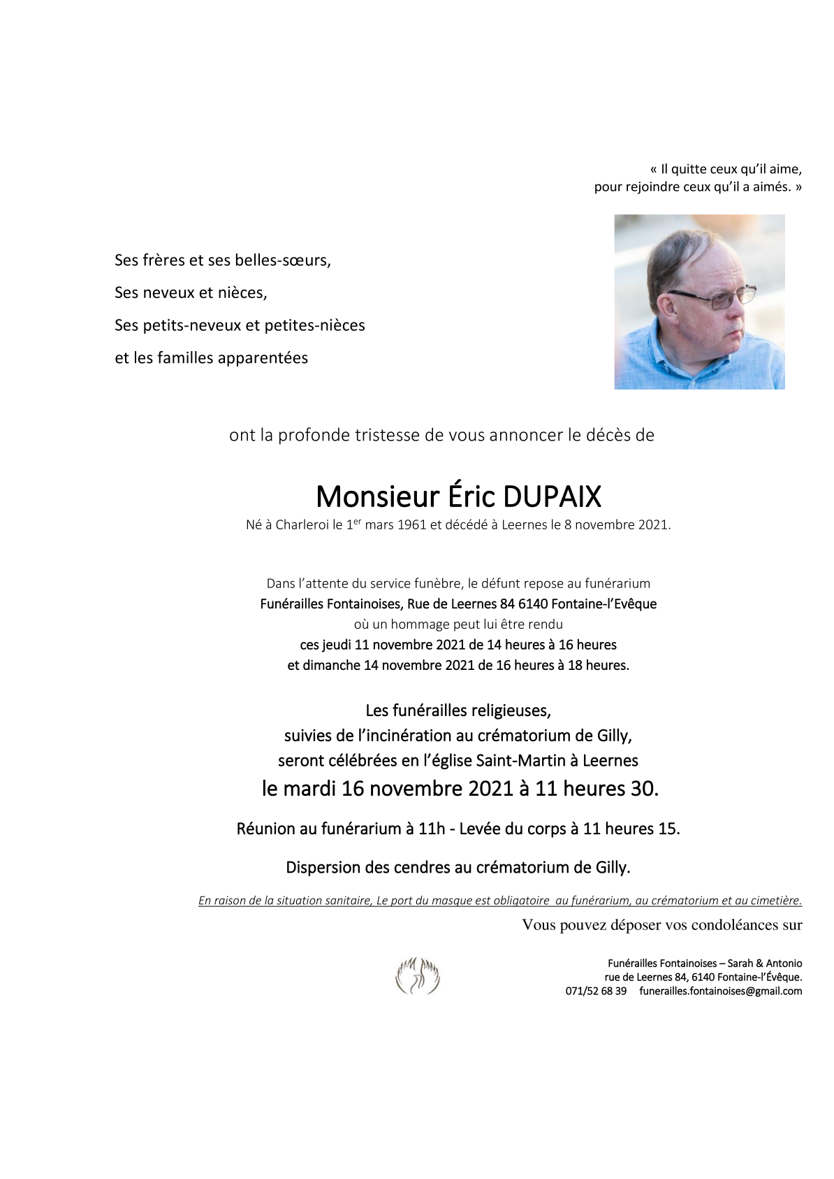 Décédé à Leernes (6142) le lundi 8 novembre 2021 à l'âge de 60 ans