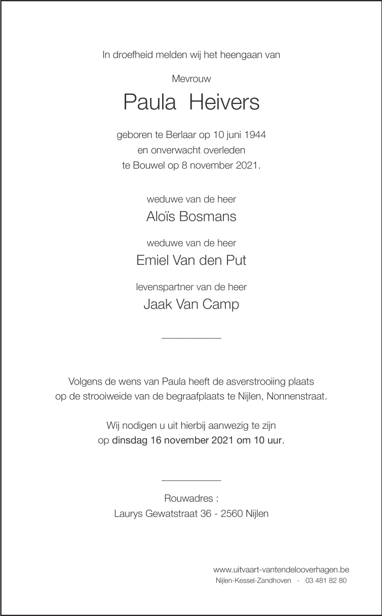 Décédée à Bouwel (2288) le lundi 8 novembre 2021 à l'âge de 77 ans