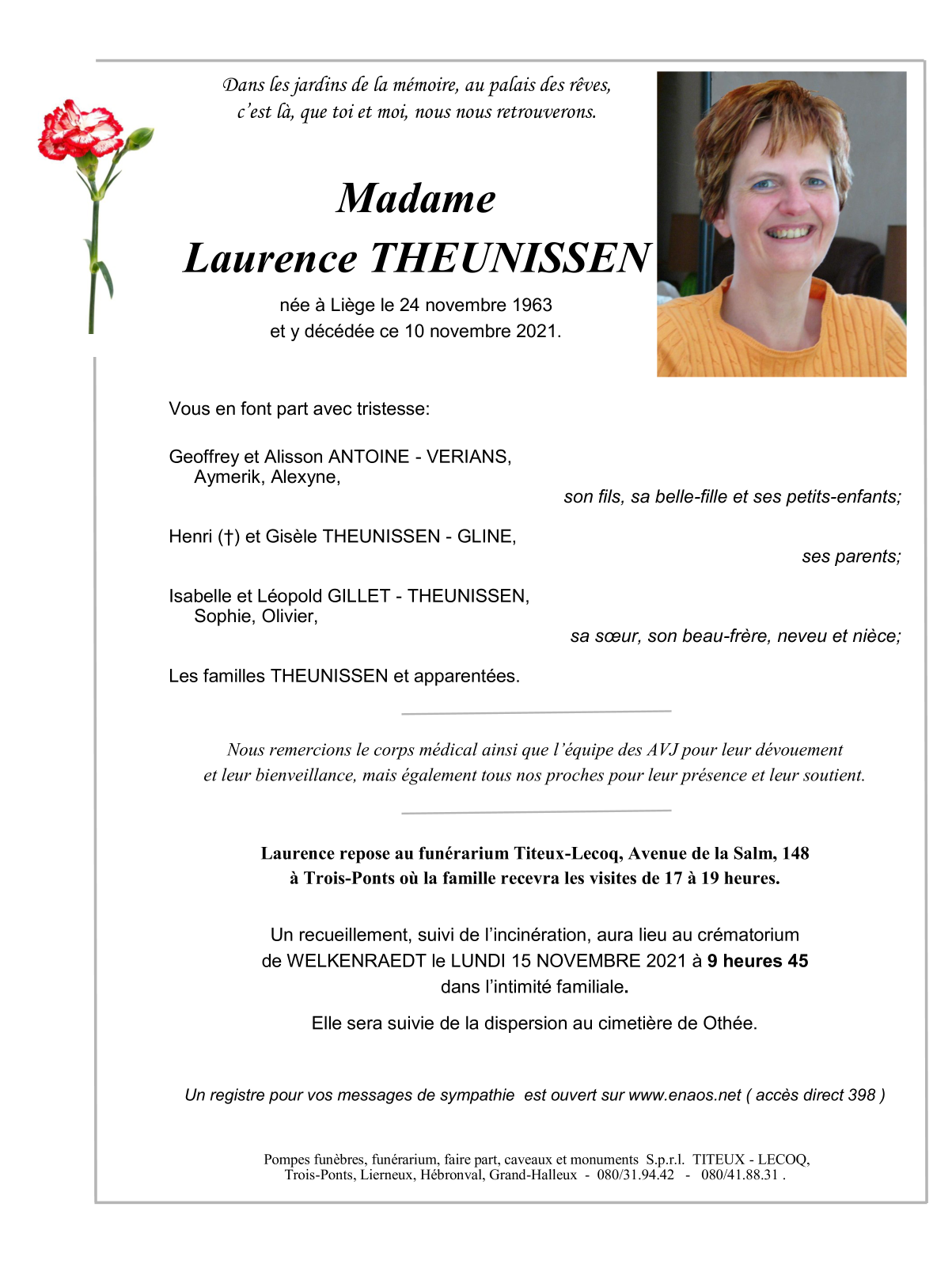 Décédée à Liège (4000) le mercredi 10 novembre 2021 à l'âge de 57 ans