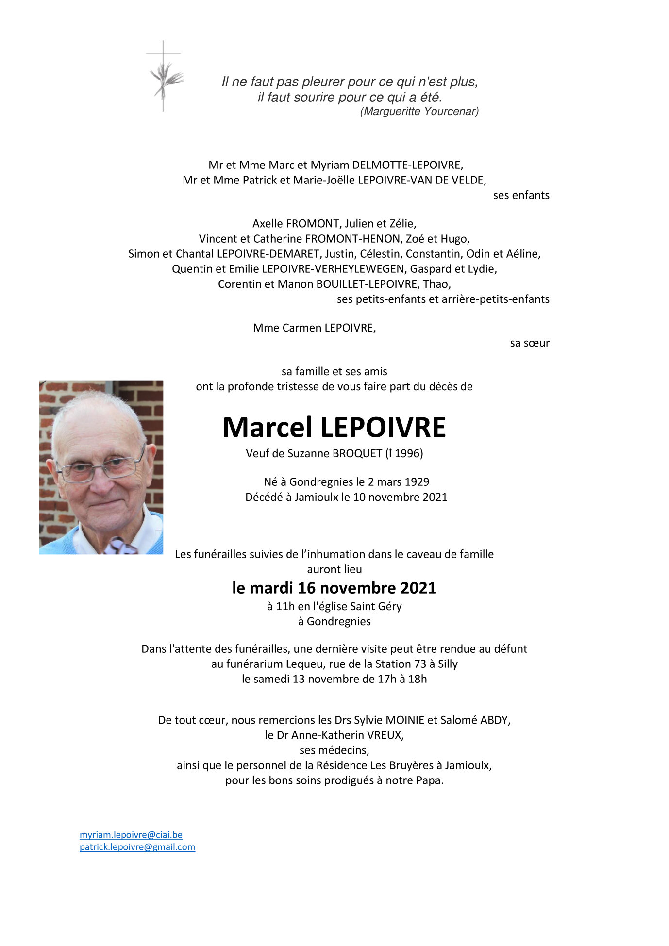Décédé à Jamioulx (6120) le mercredi 10 novembre 2021 à l'âge de 92 ans