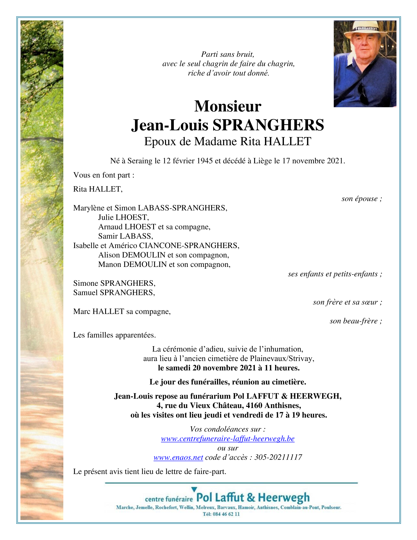 Décédé à Liège (4000) le mercredi 17 novembre 2021 à l'âge de 76 ans