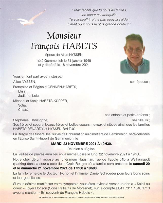 Décédé à Gemmenich (4851) le jeudi 18 novembre 2021 à l'âge de 73 ans