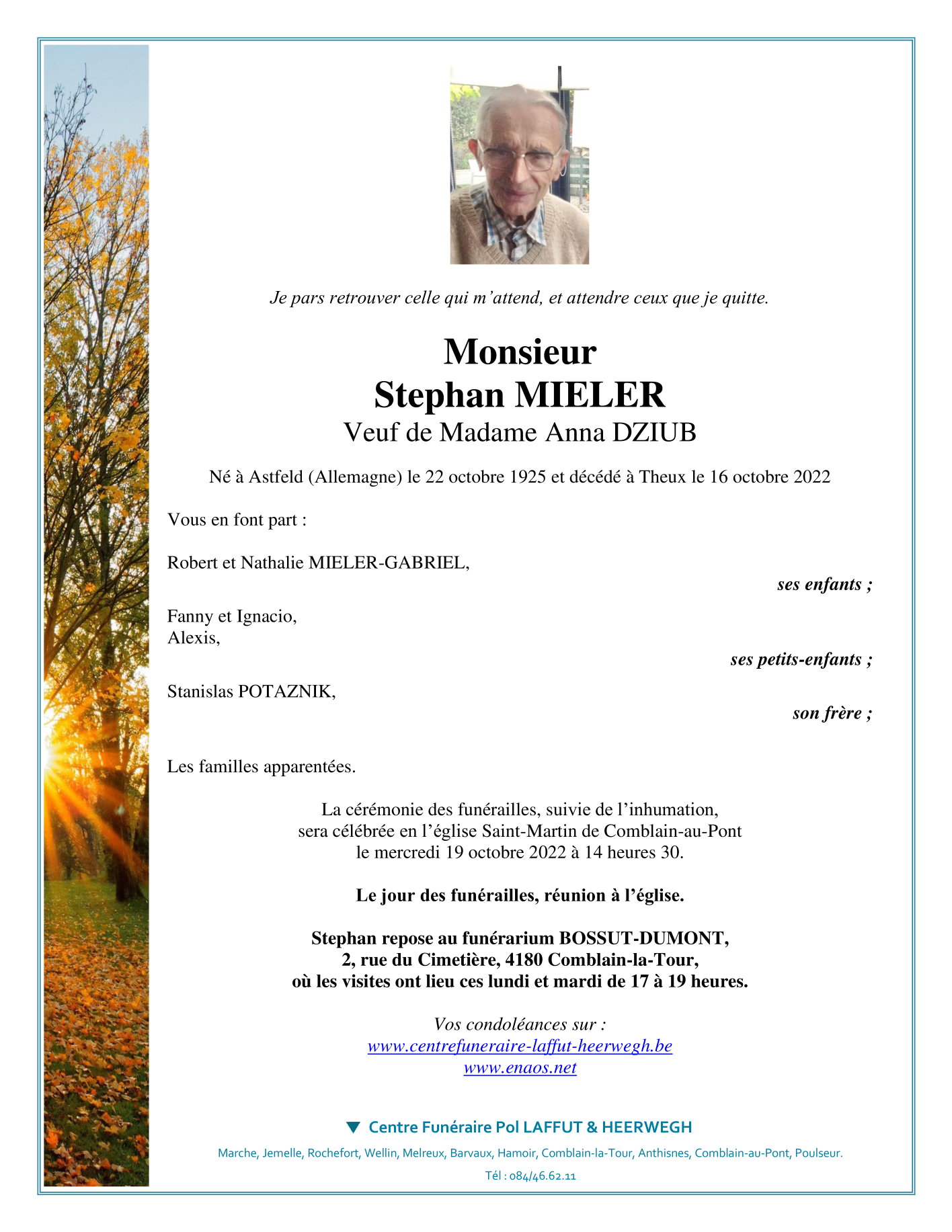 Décédé à Theux (4910) le dimanche 16 octobre 2022 à l'âge de 96 ans