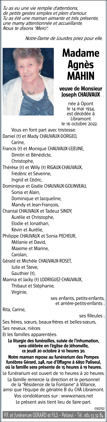 Décédée à Libramont (6800) le dimanche 16 octobre 2022 à l'âge de 88 ans