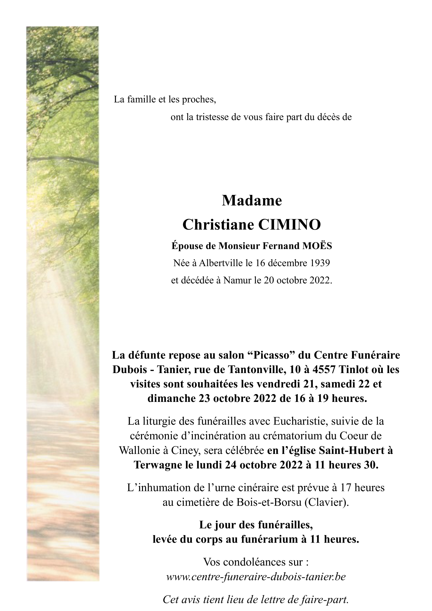 Décédée à Namur (5000) le jeudi 20 octobre 2022 à l'âge de 82 ans