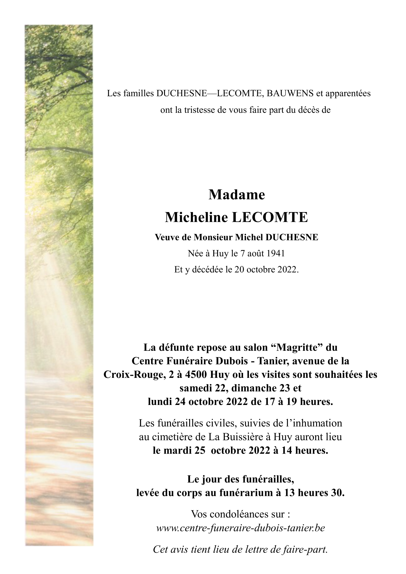 Fallecida en Huy (4500) el jueves, 20 de octubre de 2022 a la edad de 81 años