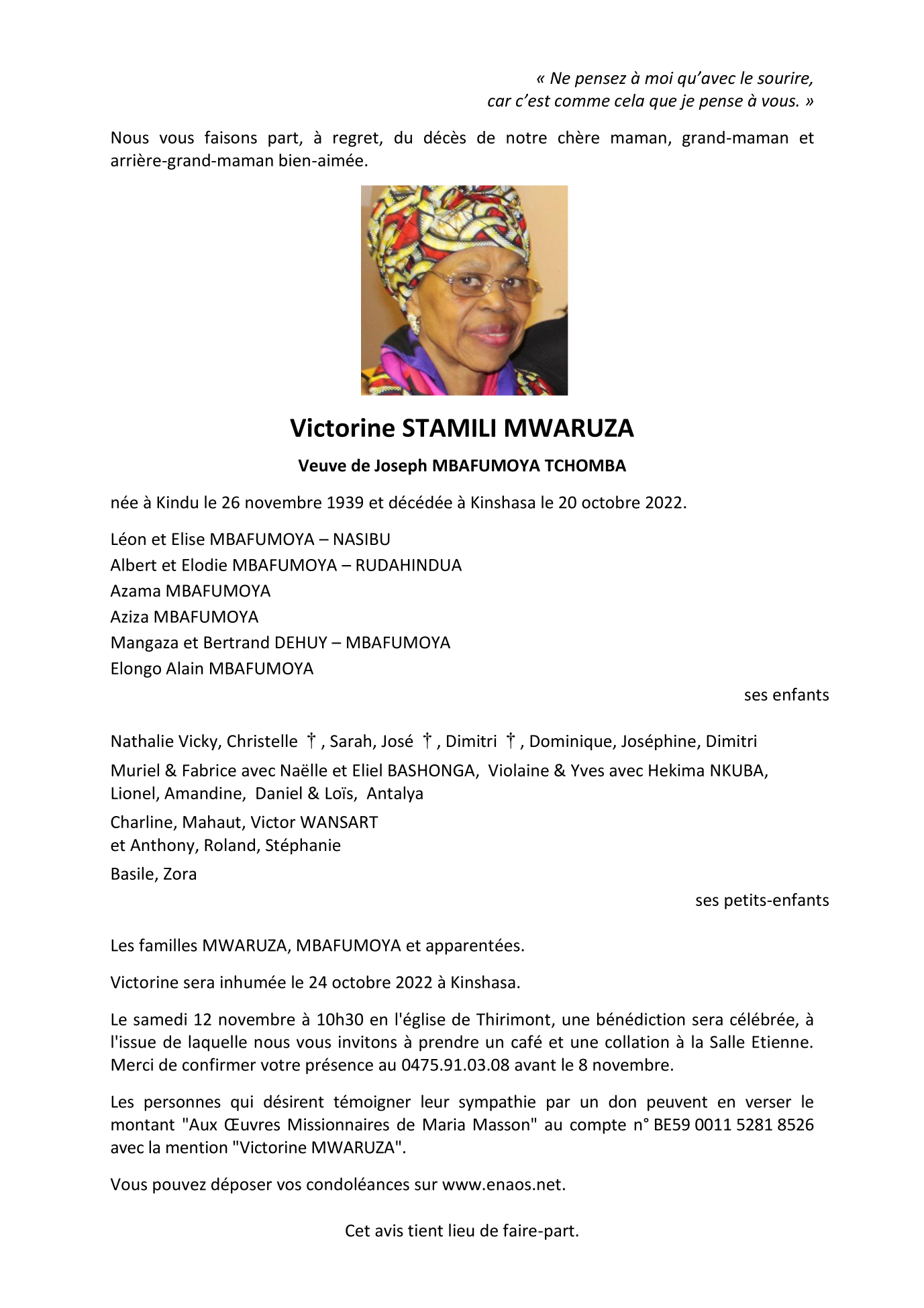 Décédée à Kinshasa (Congo) le jeudi 20 octobre 2022 à l'âge de 82 ans