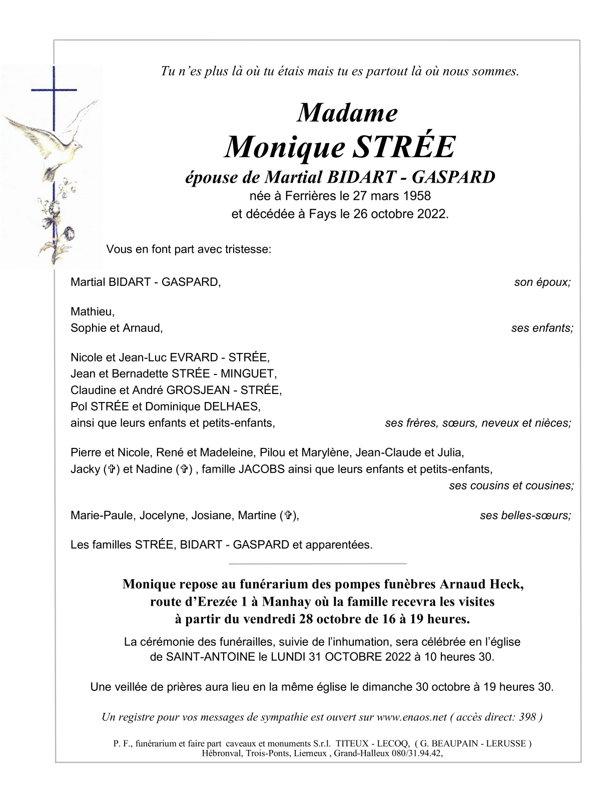 Décédée à Fays (6960) le mercredi 26 octobre 2022 à l'âge de 64 ans