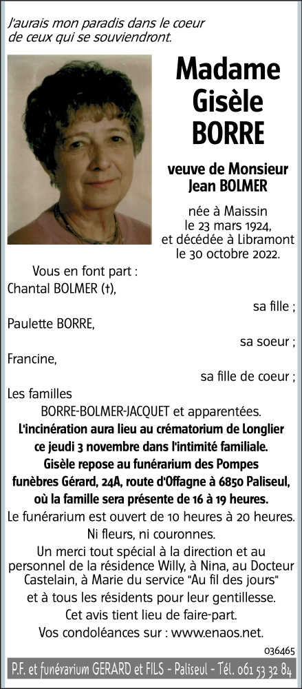 Décédée à Libramont (6800) le dimanche 30 octobre 2022 à l'âge de 98 ans