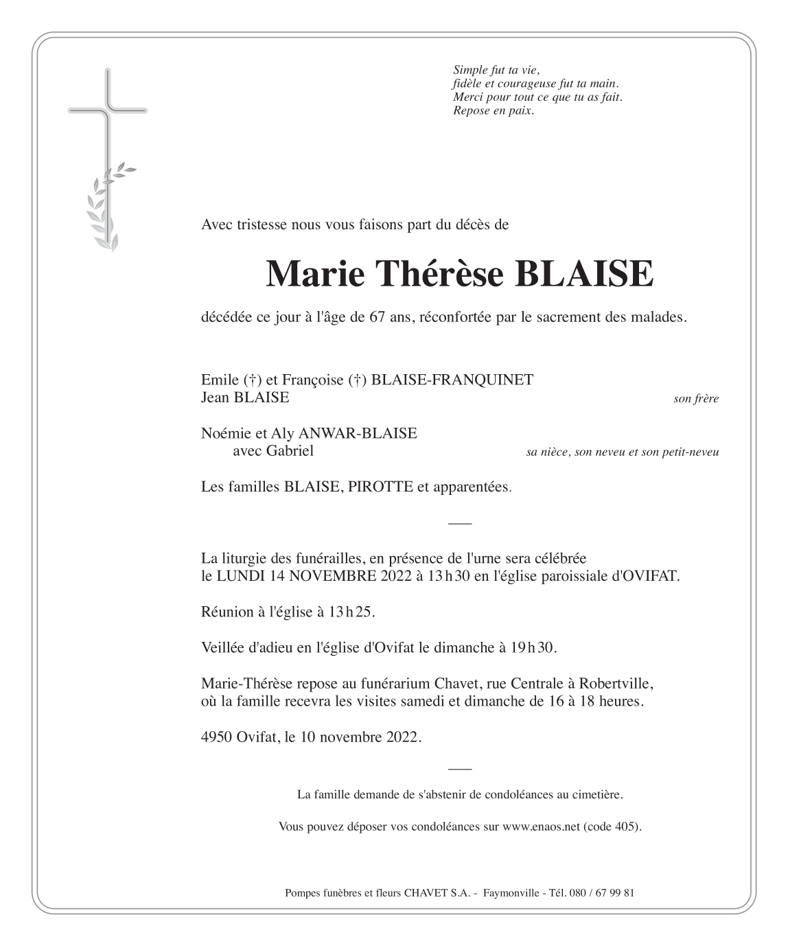 Décédée à Ovifat (4950) le jeudi 10 novembre 2022 à l'âge de 67 ans