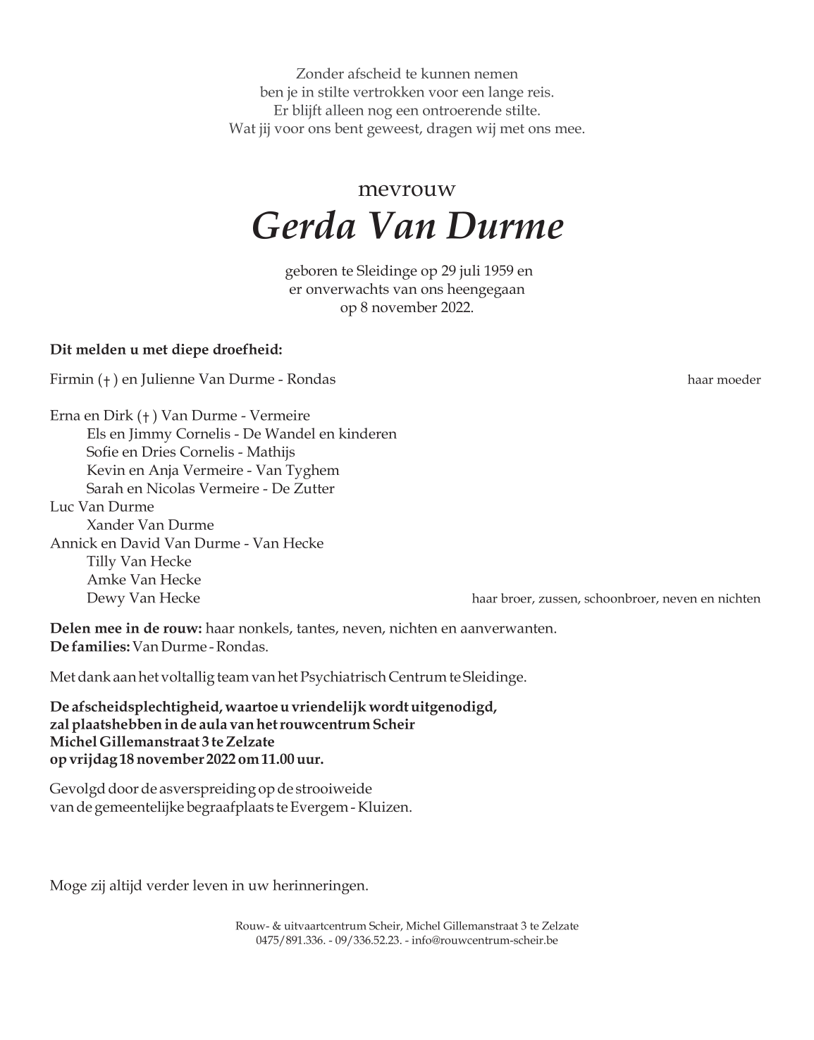 Décédée à Sleidinge (9940) le mardi 8 novembre 2022 à l'âge de 63 ans