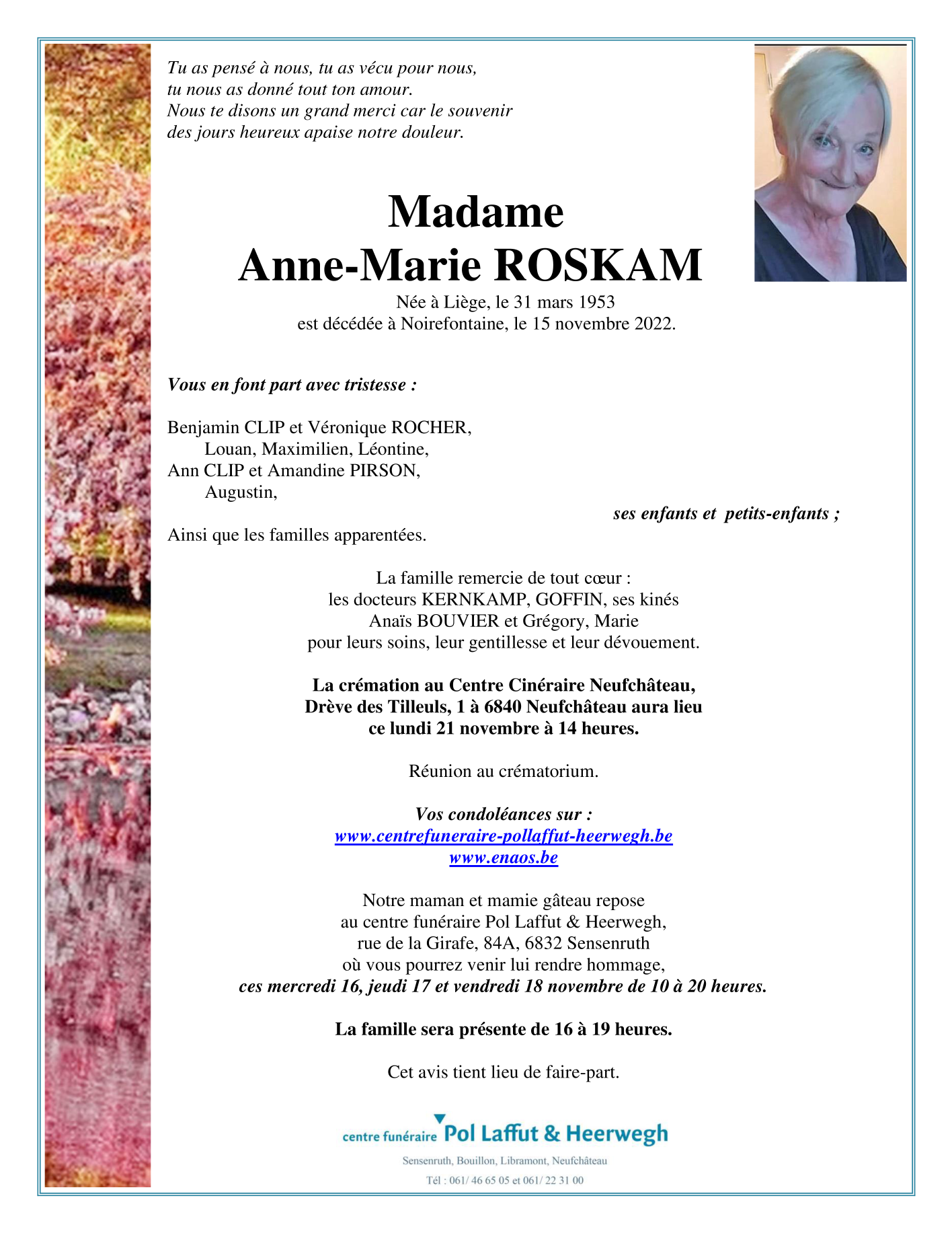 Décédée à Noirefontaine (6831) le mardi 15 novembre 2022 à l'âge de 69 ans