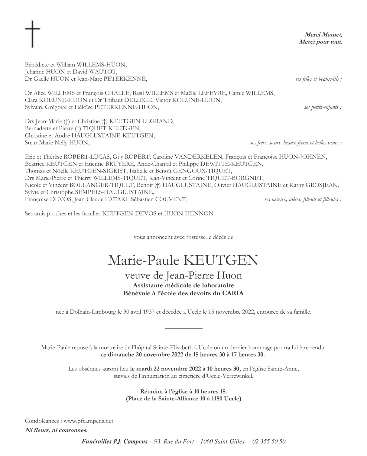 Décédée à Uccle (1180) le mardi 15 novembre 2022 à l'âge de 85 ans