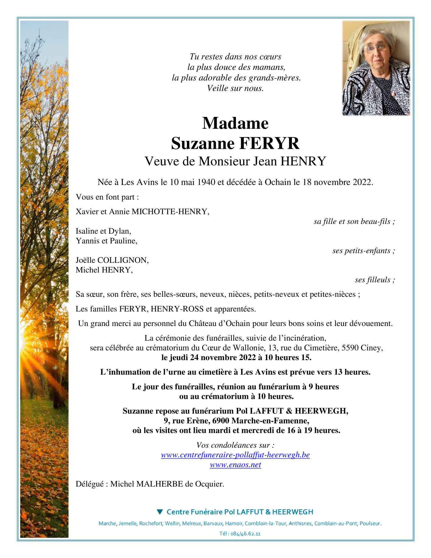 Décédée à Clavier (4560) le vendredi 18 novembre 2022 à l'âge de 82 ans