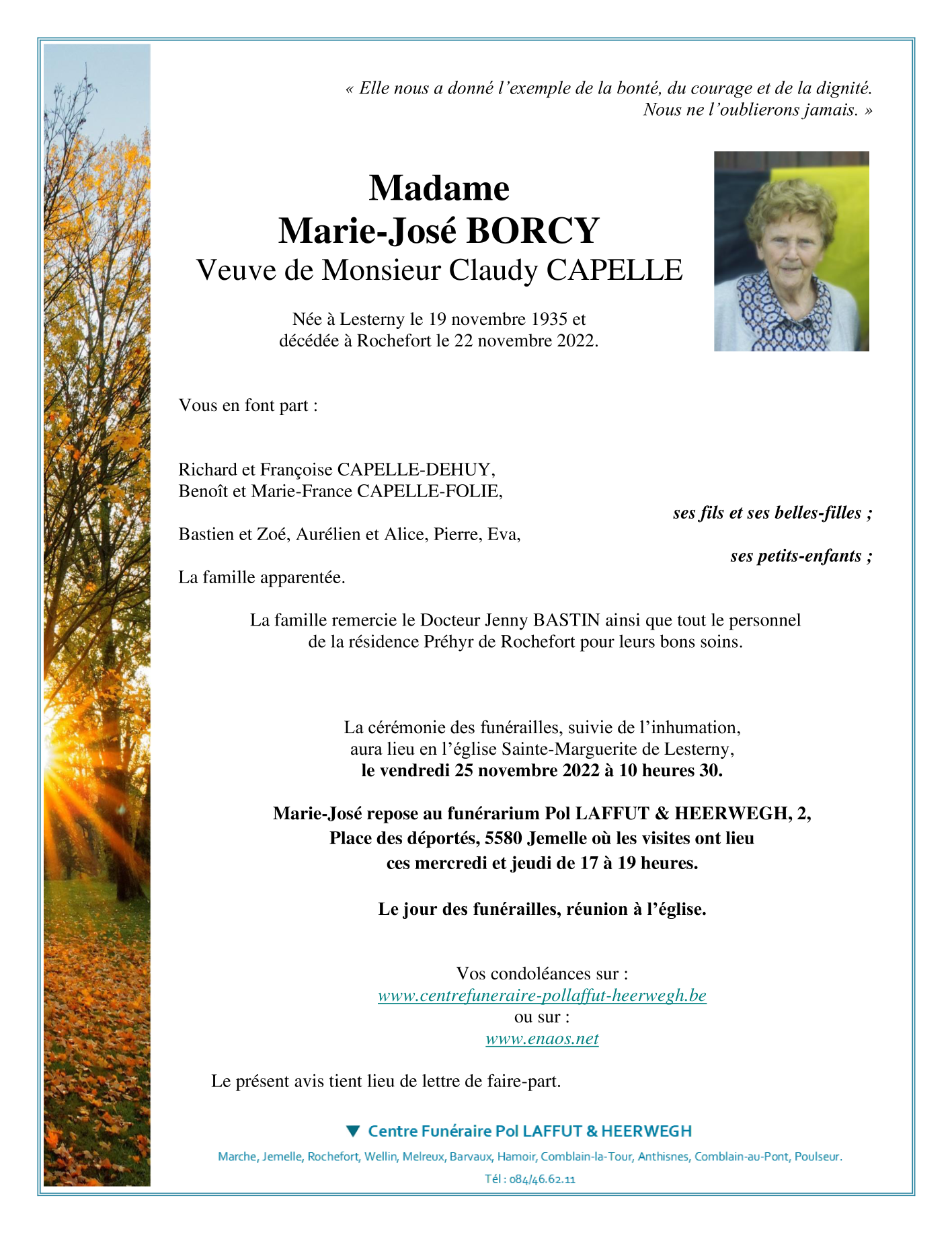 Décédée à Rochefort (5580) le mardi 22 novembre 2022 à l'âge de 87 ans