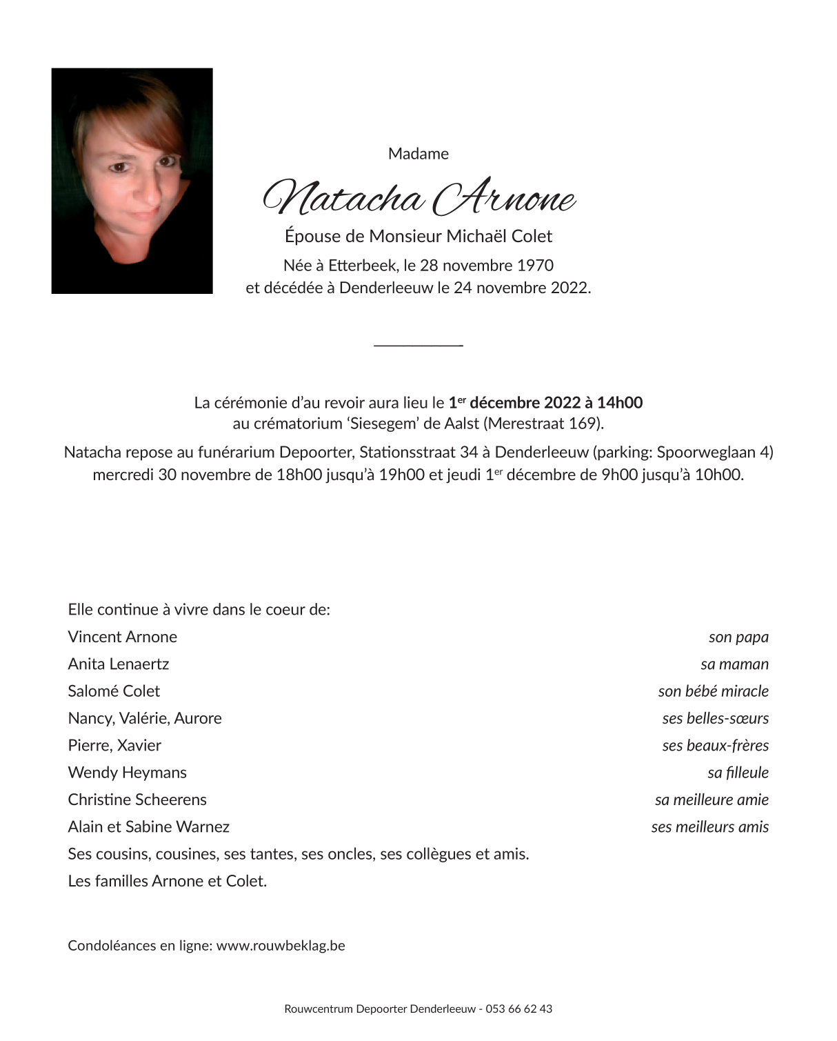 Décédée à Denderleeuw (9470) le jeudi 24 novembre 2022 à l'âge de 51 ans