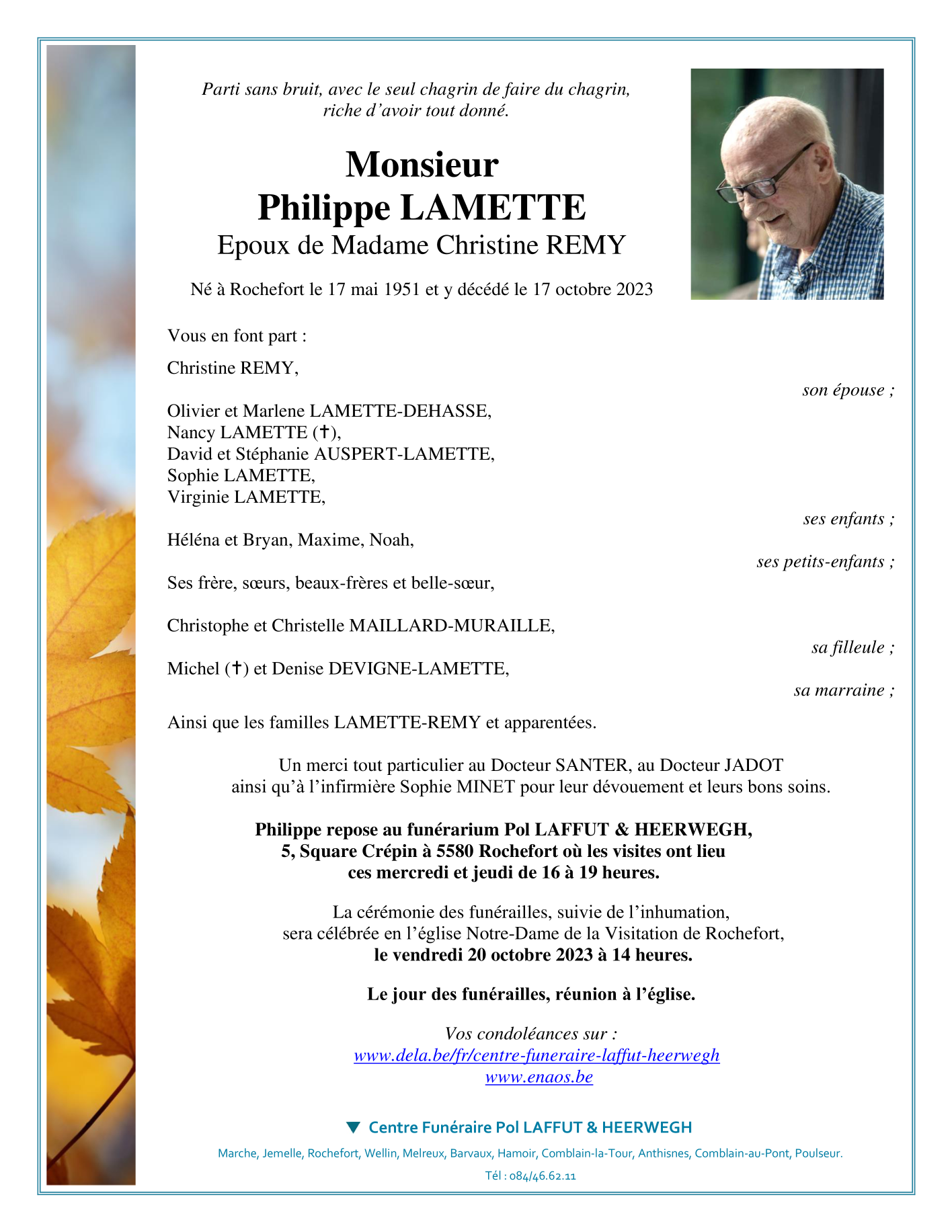 Décédé à Rochefort (5580) le mardi 17 octobre 2023 à l'âge de 72 ans