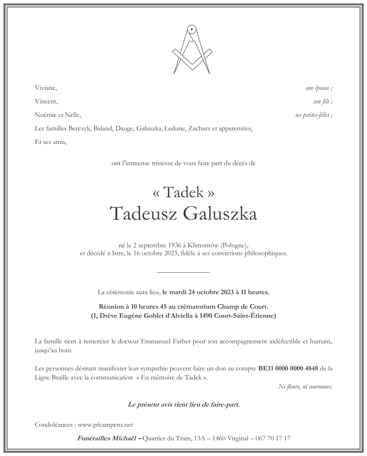 Fallecido en Ittre (1460) el lunes, 16 de octubre de 2023 a la edad de 87 años