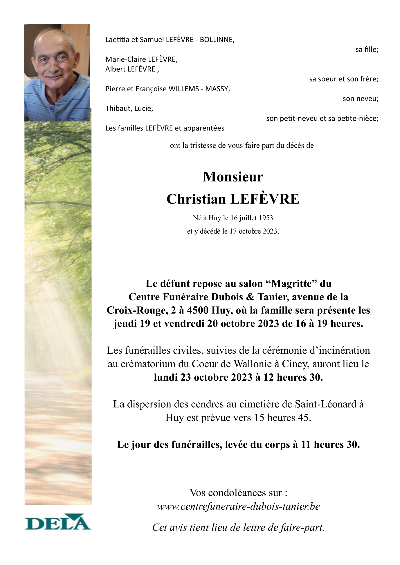 Décédé à Huy (4500) le mardi 17 octobre 2023 à l'âge de 70 ans