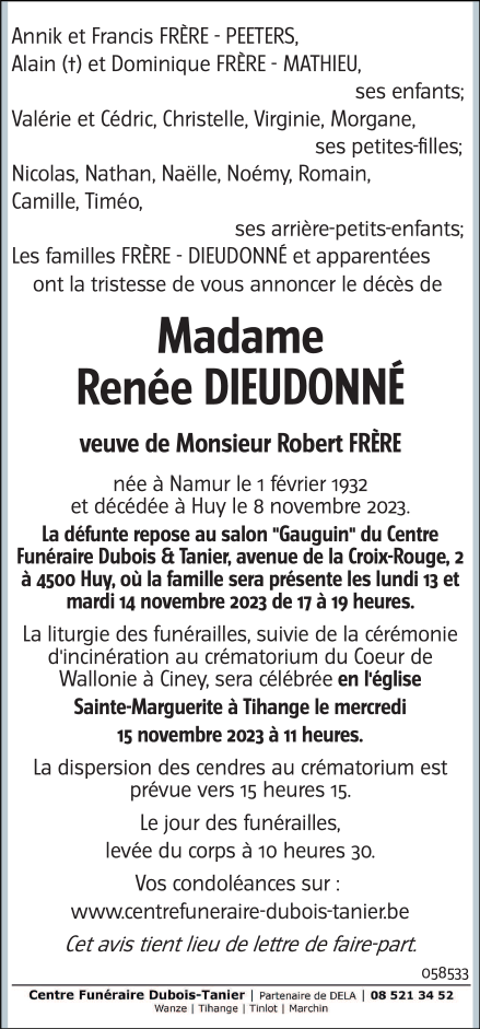Décédée à Huy (4500) le mercredi 8 novembre 2023 à l'âge de 91 ans