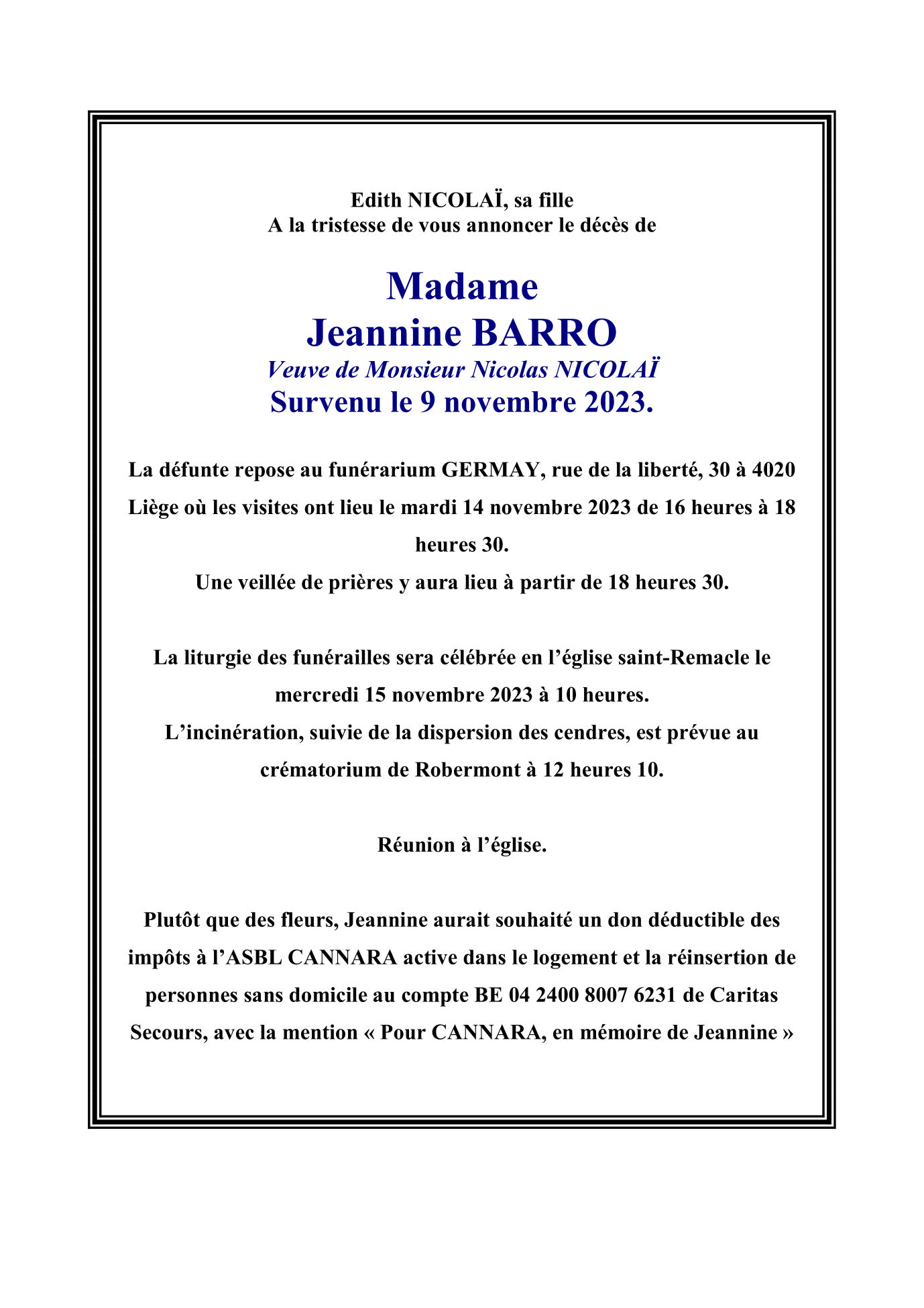 Décédée à Liège (4020) le jeudi 9 novembre 2023 à l'âge de 93 ans