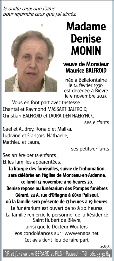 Décédée à Bievre (5555) le vendredi 10 novembre 2023 à l'âge de 93 ans
