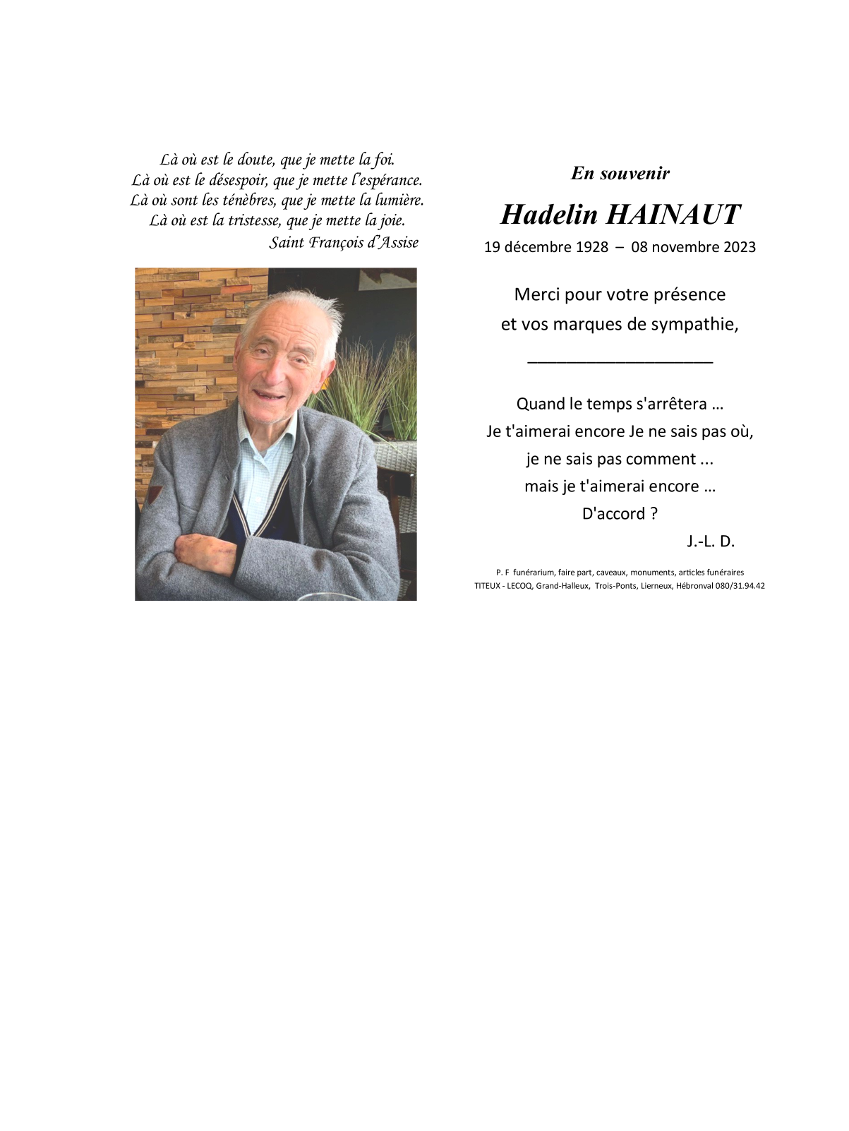 Décédé à Hermalle-sous-Argenteau (4681) le mercredi 8 novembre 2023 à l'âge de 94 ans