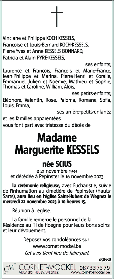 Décédée à Pepinster (4860) le jeudi 16 novembre 2023 à l'âge de 89 ans