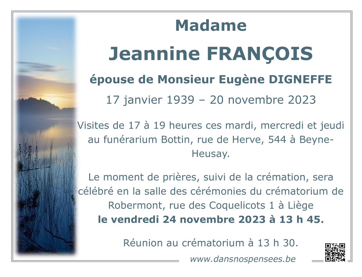 Décédée à Chênée (4032) le lundi 20 novembre 2023 à l'âge de 84 ans