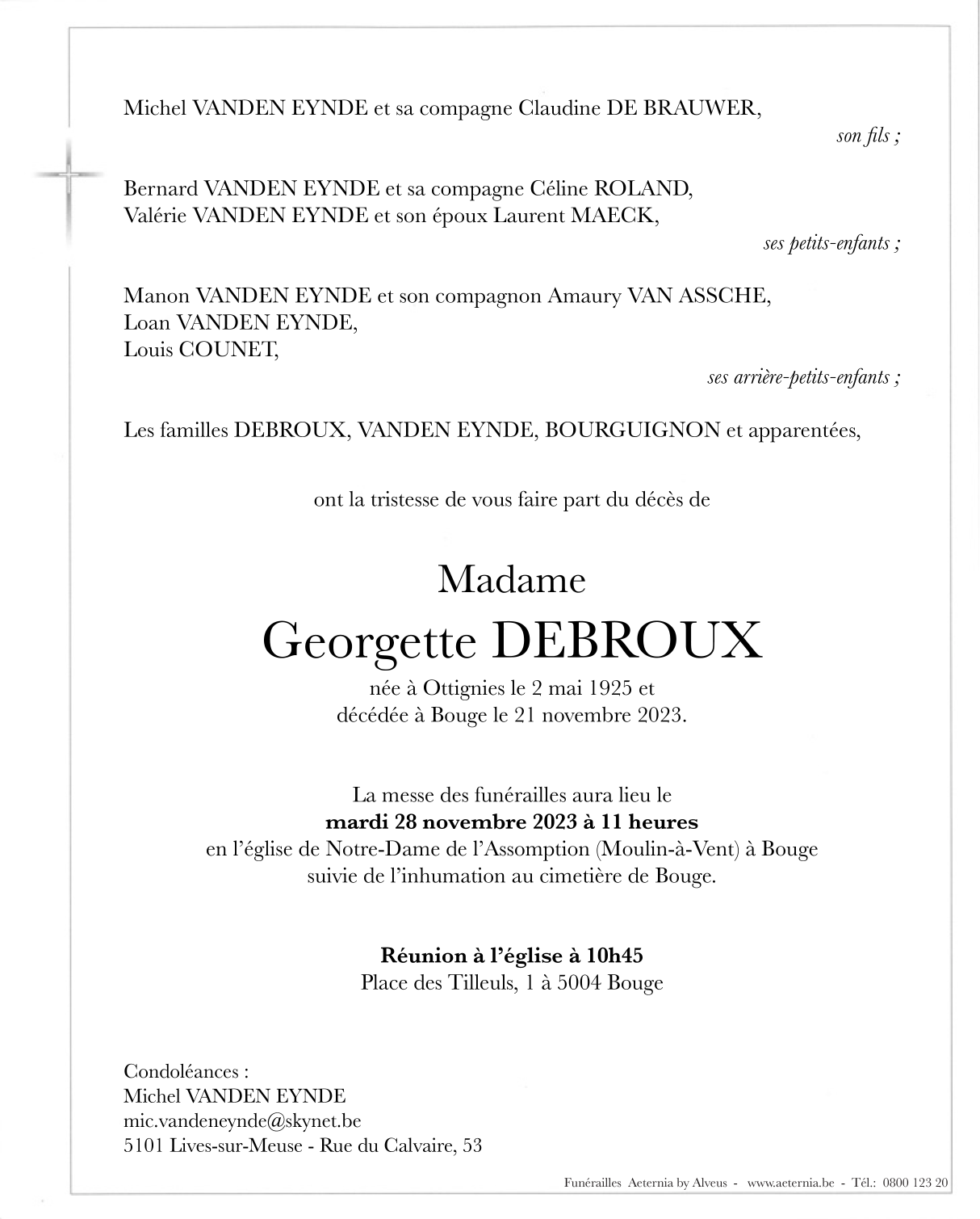 Décédée à Bouge (5004) le mardi 21 novembre 2023 à l'âge de 98 ans