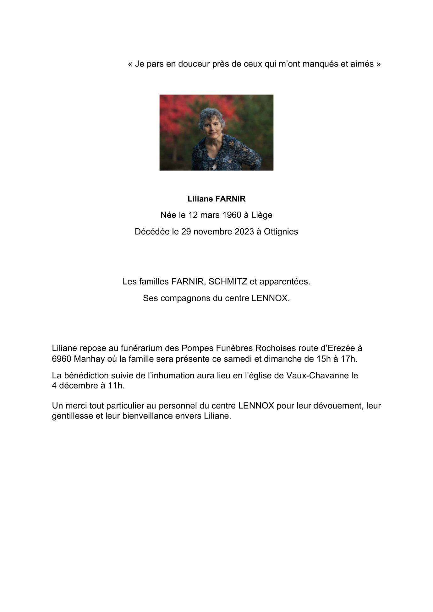 Fallecida en Ottignies (1340) el miércoles, 29 de noviembre de 2023 a la edad de 63 años