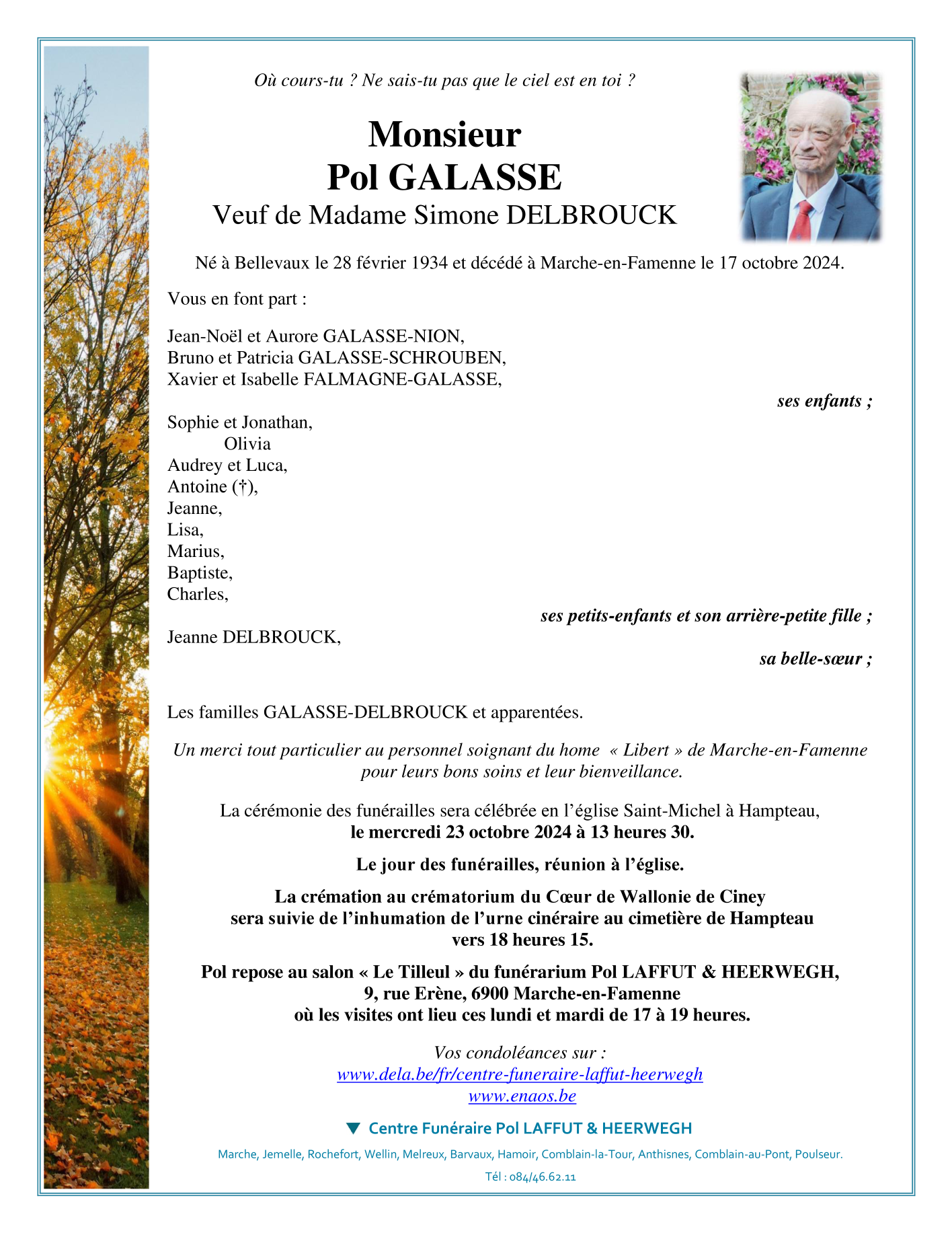 Décédé à Marche-en-Famenne (6900) le jeudi 17 octobre 2024 à l'âge de 90 ans