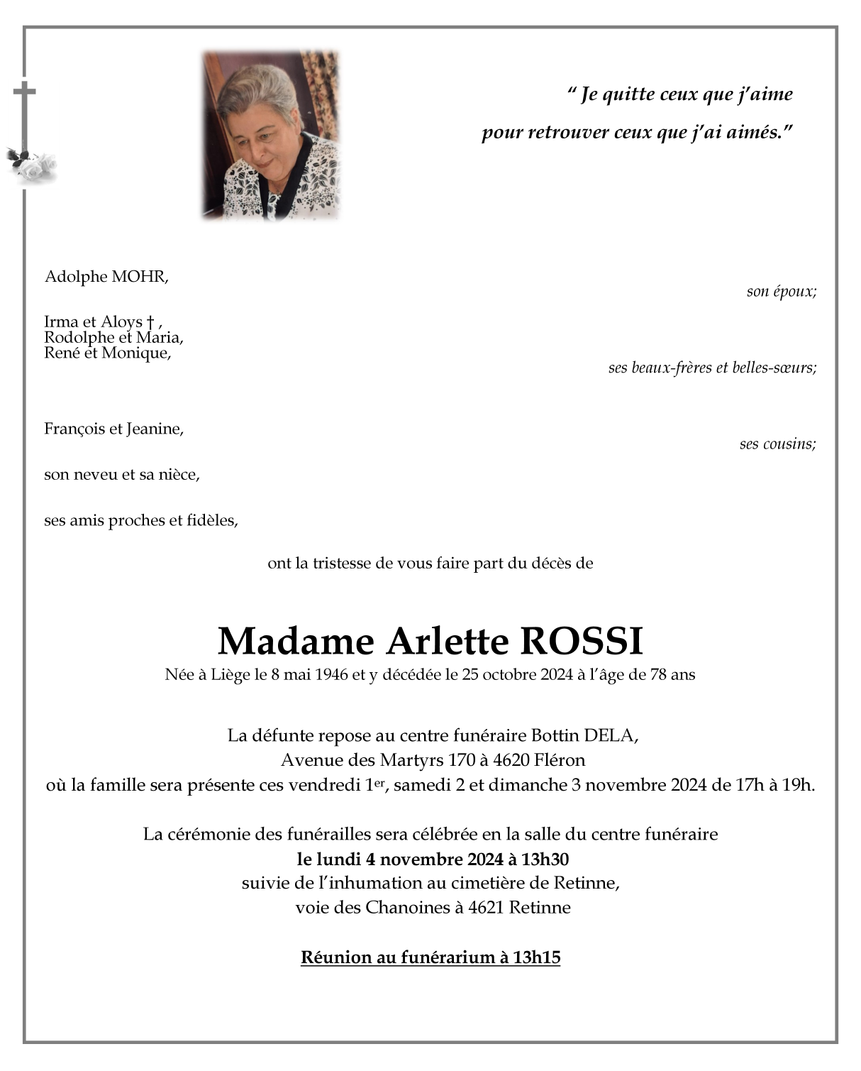 Décédée à Liège (4000) le vendredi 25 octobre 2024 à l'âge de 78 ans