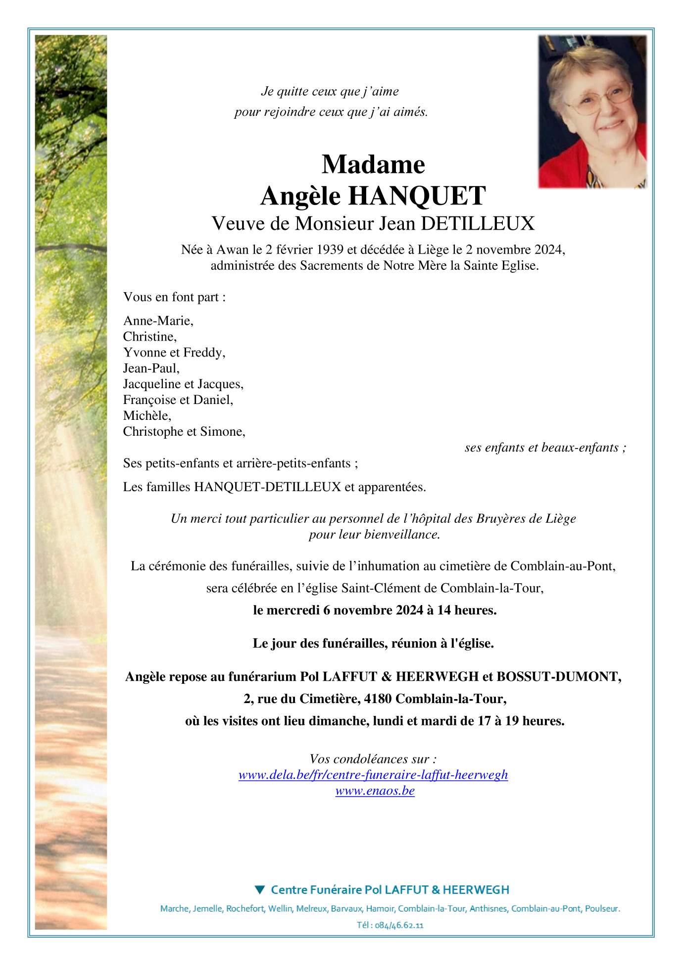 Fallecida en Liège (4000) el sábado, 2 de noviembre de 2024 a la edad de 85 años