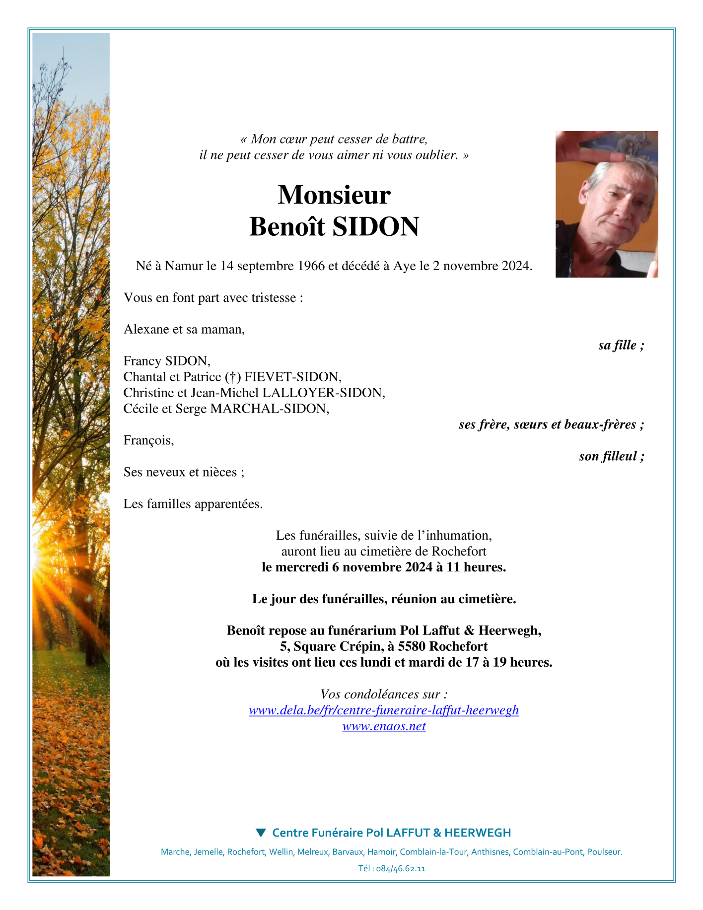 Décédé à Aye (6900) le samedi 2 novembre 2024 à l'âge de 58 ans