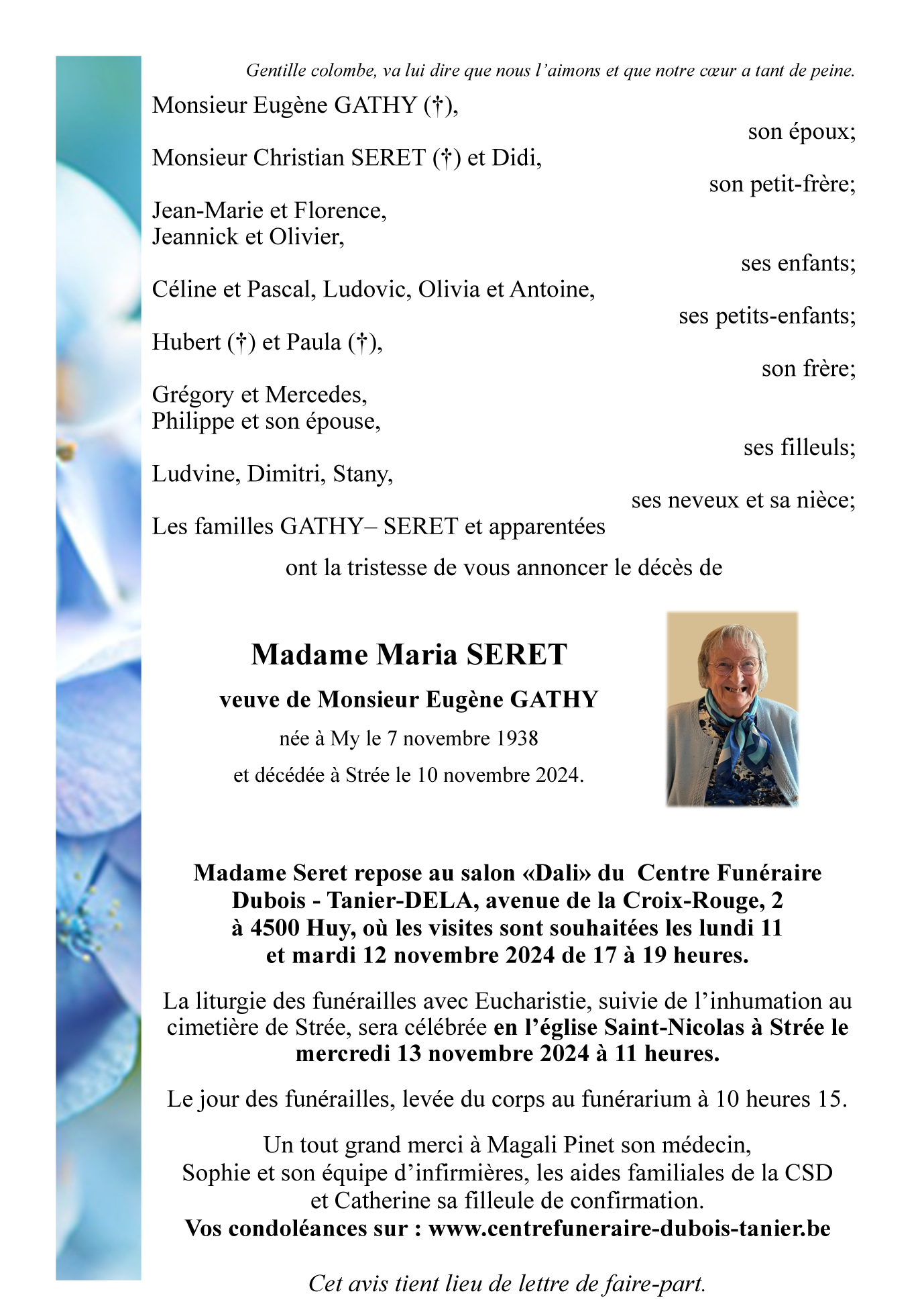 Décédée à Strée (4577) le dimanche 10 novembre 2024 à l'âge de 86 ans